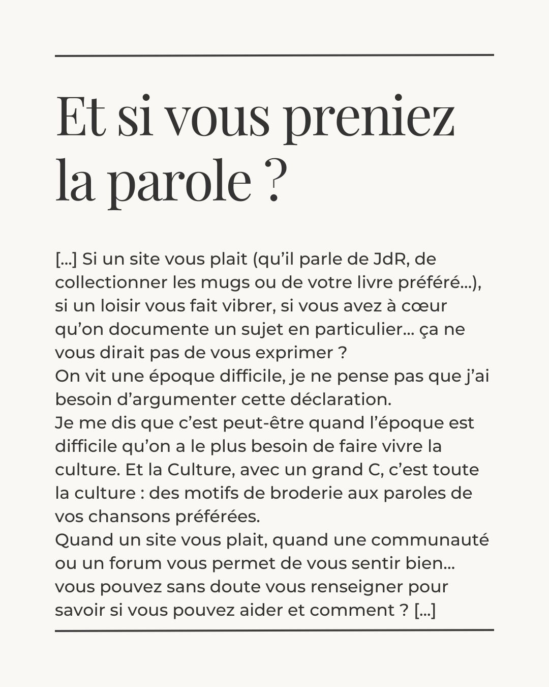 Je me dis que c’est peut-être quand l’époque est difficile qu’on a le plus besoin de faire vivre la culture. Et la Culture, avec un grand C, c’est toute la culture : des motifs de broderie aux paroles de vos chansons préférées.